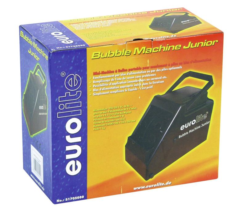 Eurolite B60 Junior mašina za mjehuriće. Kataloška šifra: 51705080. Eurolite B60 kompaktna mašina za mjehuriće za rad na baterije ili adapter. Punjenje tekućine je jednostavno i ima nebrojene mogućnosti primjene: karnevali, rođendani, vjenčanja, tulumi itd. Radi preko priloženog strujnog adaptera.