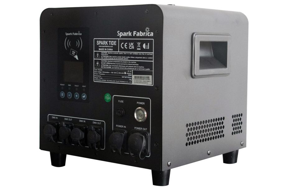 The Spark Tide SF-X5 is the world`s first version of the IP55 waterproof cold spark machine. Linear height, density, and duration, IP Rate: IP55, TFT LCD Screen, true power con and 3/5 pin In/ Out, Adjustable height: 2 - 5m , RF remote control, hopper with capacity 300gr, Stainless steel black casing, 12kg.