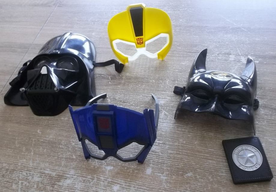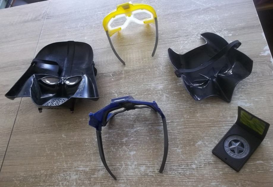 Prodajem hrpu rabljene plastične "opreme" za maškare / maskenbal koja uključuje 2 maske kao naočale, 1 masku na čičak + guma, 1 masku na gumu te legitimaciju za policajca. Dobivene nedavno uz hrpu stvari od poznanice, meni nepotrebne i želim dati dalje. Vikinški šljem sam naknadno našla, dajem u zatečenom stanju (promjer = 19 cm). Javite ako su Vam zanimljive.