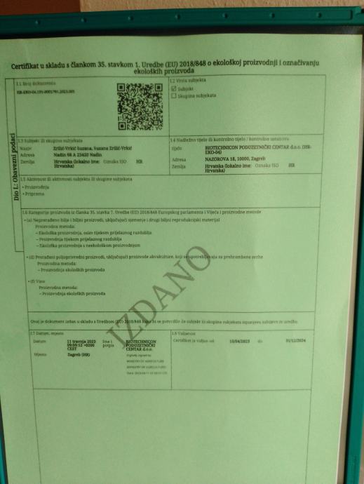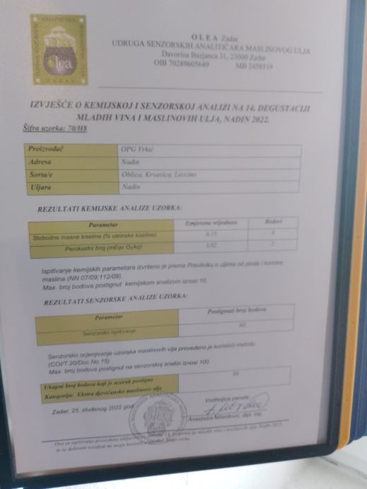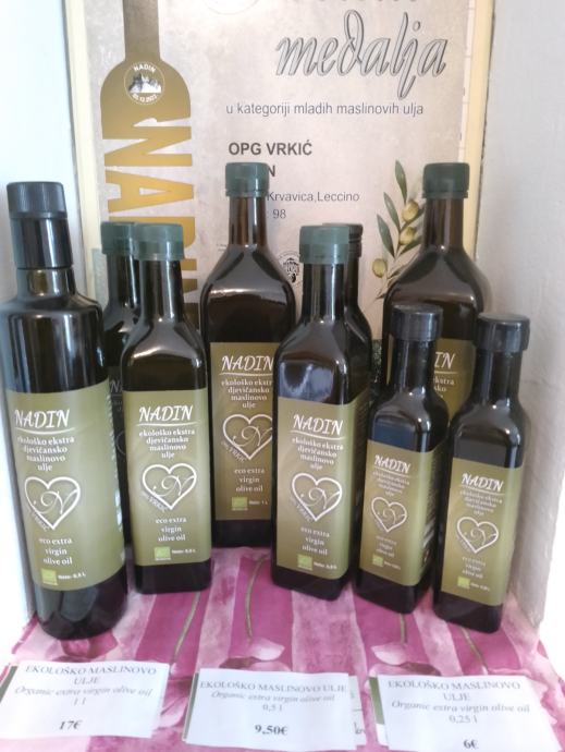 Ulje je dobiveno hladnim prešanjem maslina u ekološkoj uljari Nadin,a masline su iz vlastitog maslinika koji su u ekološkom uzgoju s važećim ekološkim certifikatom za 2023/2024 godinu.Nase ulje redovito svake godine dajemo na natjecanje za kvalitetu gdje redovito svake godine dobiva zlatne medalje,pa tako i ove godine na natjecanju u sukošanu na natjecanju zvanoj "peljuzica" nase ulje je dobilo zlatnu medalju kao ekološko ekstra djevičansko maslinovo ulje.