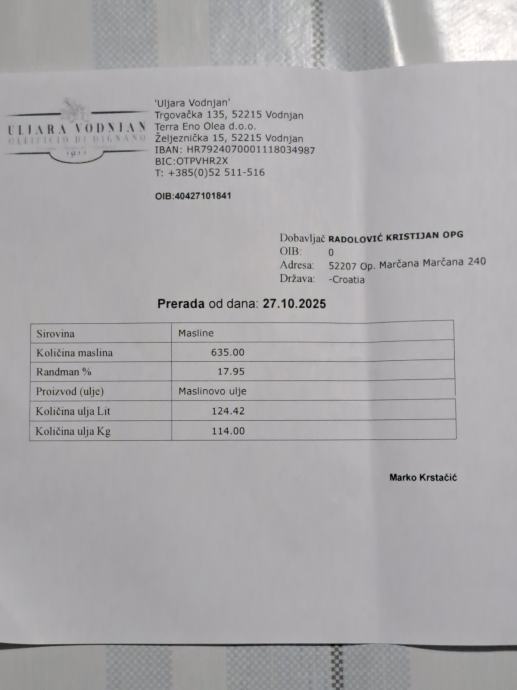 Prodajem domaće, extra djevičansko mlado maslinovo ulje vrhunske kvalitete odlične boje i mirisa. Hladno prešano prerađeno u Agroproduktu u Vodnjanu 18.10.2025., svega nekoliko sati poslje branja.