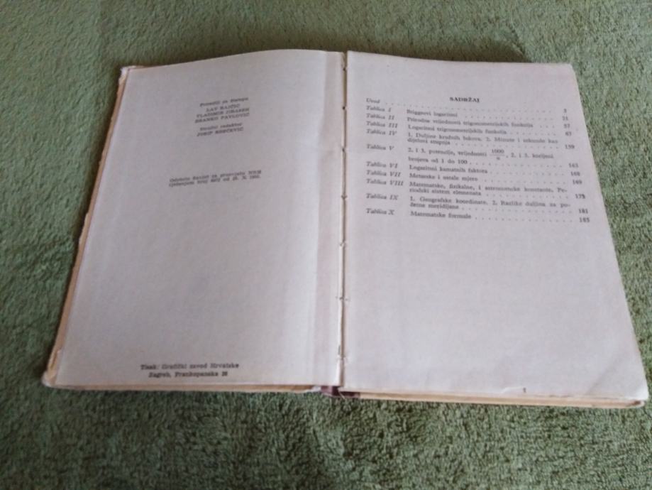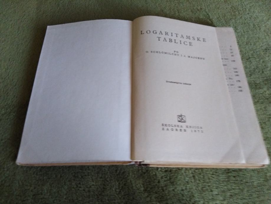 Logaritamske tablice po O. Schlomilchu i J. Majcenu, dvadeset prvo izdanje, Školska knjiga Zagreb 1972 godina.