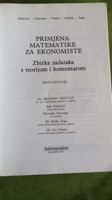 PRIMJENA MATEMATIKE ZA EKONOMISTE Sekulić, Dabčević, Dravinac, Franić