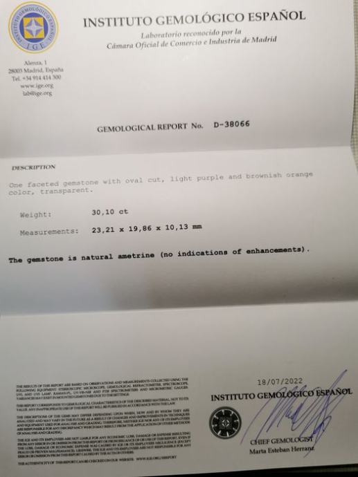 Prirodni ljubičasto smeđi ametrin sa certifikatom međunarodno priznatog laboratorija