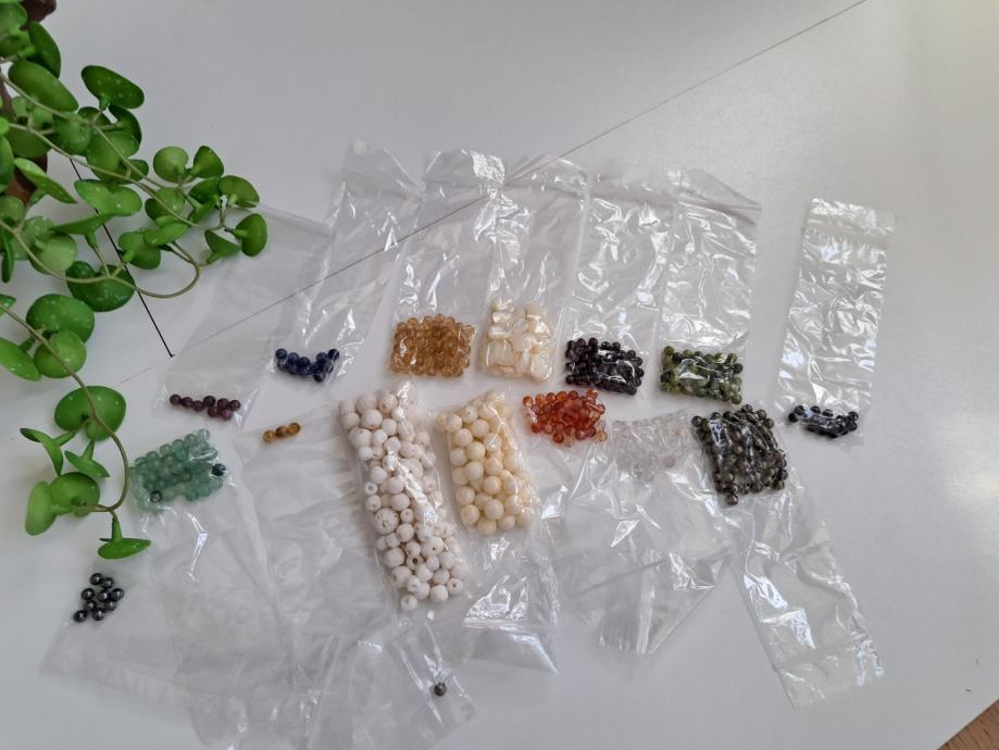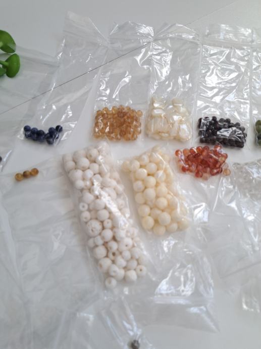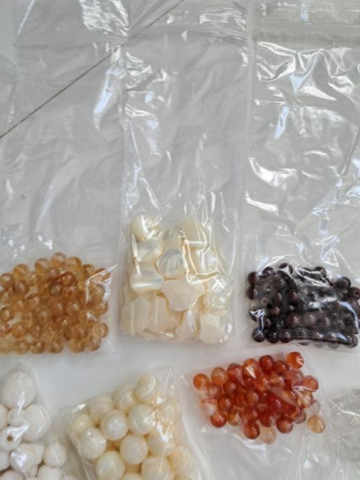 Predivan lot perli od prirodnog dragog kamenja, koralja i sedefa. Koralj i sedef donijeti sa Sejšela, drago kamenje pažljivo odabrano i naručeno iz Engleske. Sve je izmiješano, pa točno ne znam što je što, ali u nastavku je popis naručenih perli: