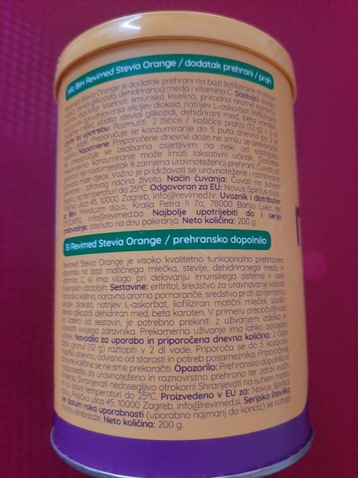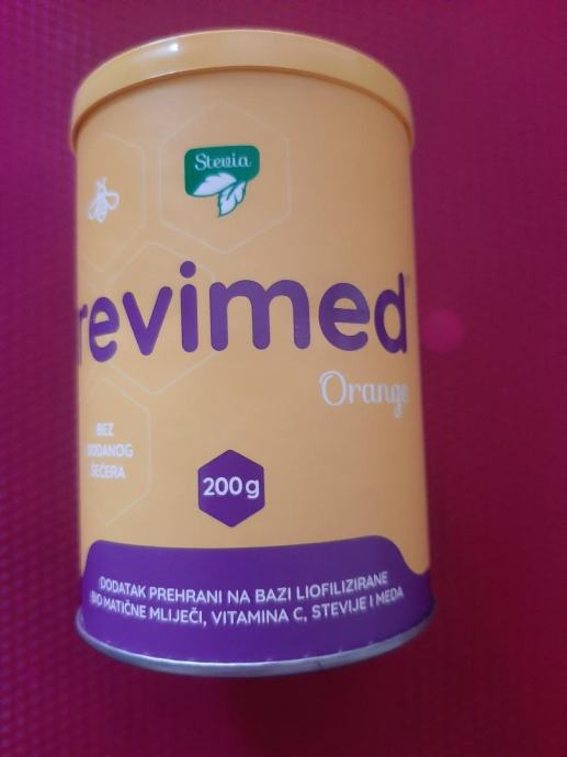 REVIMED® Stevia Orange je prirodni visokokvalitetni dodatak prehrani na osnovi liofilizirane BIO matične mliječi, dehidriranog meda, stevije i vitamina C za pripremu napitka s okusom naranče. Namijenjen je svima koji se žele pravilno hraniti i popraviti ili tijekom duljeg razdoblja održavati dobro stanje organizma i snažan imunitet.