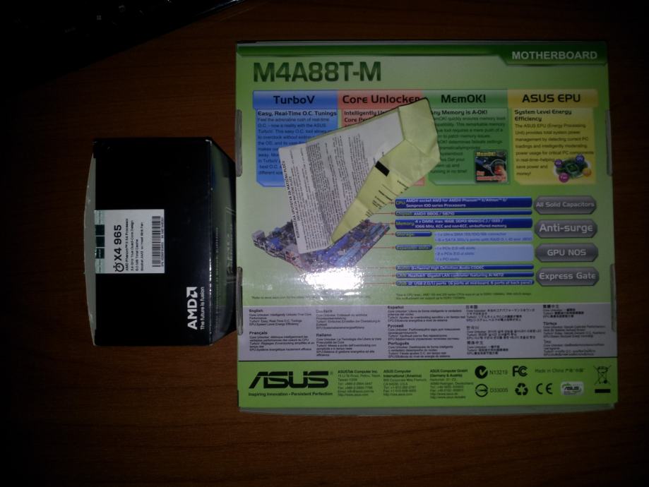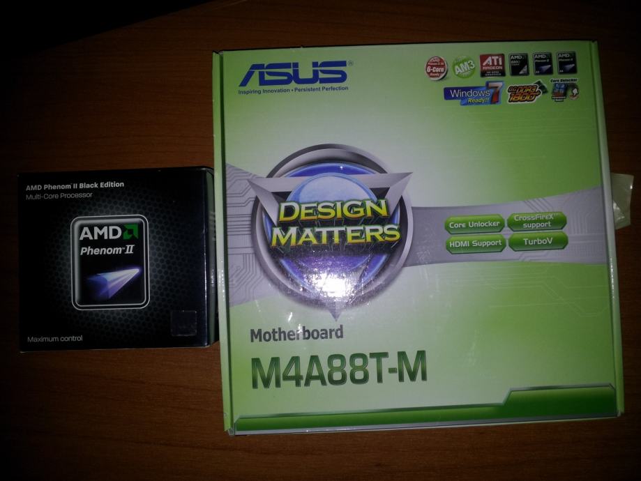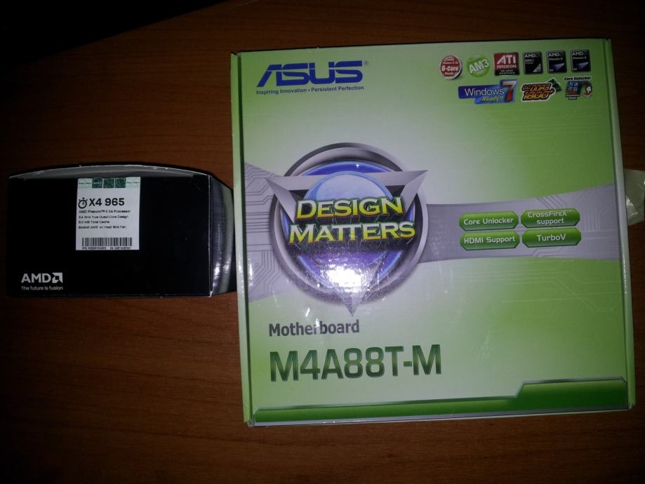 Prodajem Asus m4a88t-m i Amd Phenom II x4 965 Black edition 3.4 GHz FULL BUNDLE. Cijeli komplet u kutijama original sa svime što se inače dobije. Komponente rade savršeno, staro sve godinu dana. Nije radilo pod velikim opterećenjima, većinom malo igranje igara i to je to. Matična dolazi sa odličnim funcijama: otključavanje procesora, jednostavni overclock, štednja energije, usb 3.0, SLI crossfire, jednostavno riješavanje problema sa RAM memorijom, Turbo Key itd. Procesor je odličan ima ogromnu mogućnost Overclockanja zbog black edition-a. Sve u svemu perfektno idu zajedno ovaj procesor i matična.