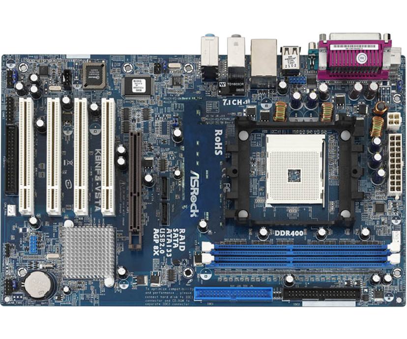 Socket 754 for AMD Athlon™ 64 and Sempron processors NVIDIA® nForce3 250 Chipset FSB 800MHz, Hyper-Transport Technology and AMD Cool 'n' Quiet Technology Supports DDR400/333/266 with 2 DIMM slots, maximum capacity up to 2GB Hybrid Booster - ASRock Safe Overclocking Technology Untied Overclocking : During Overclocking, FSB enjoys better margin due to fixed AGP/ PCI Buses 1 x AGP 8X slot 2 x SATA 1.5Gb/s connectors, supports RAID (RAID 0, 1, JBOD) and Hot Plug functions 7.1 CH Windows® Vista™ Premium Level Superior Audio (C-Media CM6501 Audio Codec with UAA architecture), 10/100 Ethernet LAN Windows® Vista™ Premium 2007 Logo Ready ASRock 8CH I/O: 4 ready-to-use USB Ports, 7.1 channel audio jacks