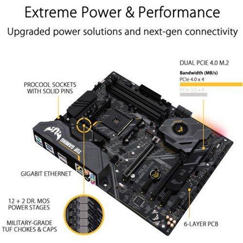 AMD AM4 X570 ATX gaming motherboard with PCIe 4.0, dual M.2, 14 Dr. MOS power stages, HDMI, DP, SATA 6Gb/s, USB 3.2 Gen 2 and Aura Sync RGB lighting. Enhanced Power Solution: 12+2 Dr. MOS power stages, 6-layer PCB, ProCool sockets, military-grade TUF components, and Digi+ VRM for maximum durability. Comprehensive Cooling: Active chipset heatsink, VRM heatsink, M.2 heatsink, hybrid fan headers and Fan Xpert 4. Next-Gen Connectivity: Dual PCIe 4.0 M.2, USB 3.2 Gen 2 ports, exclusive Realtek® L8200A Gigabit Ethernet, TUF LANGuard and TurboLAN technology. Realtek S1200A Codec: Pristine audio quality with unprecedented 108dB signal-to-noise ratio for stereo line-out and 103dB SNR for line-in. Aura Sync RGB: Synchronize LED lighting with a vast portfolio of compatible PC gear, including addressable RGB strips. TUF Gaming Alliance: ASUS hardware ecosystem ensures the best compatibility and complementary aesthetics from components to case