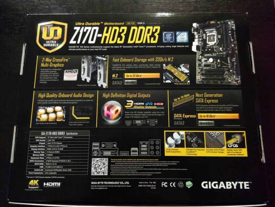 Gigabyte GA-Z170-HD3 DDR3, s1151, Intel® Z170 Express, 4 x DDR3, 1 x PCI Express x16 utor, x16 (PCIEX16), 1 x PCI Express x16 utor, x4 PCIEX4), 2 x PCI Express x1 utora, 6x USB3.0, 1 x M.2 Socket 3 , 3 x SATA Express, 6 x SATA 6GB