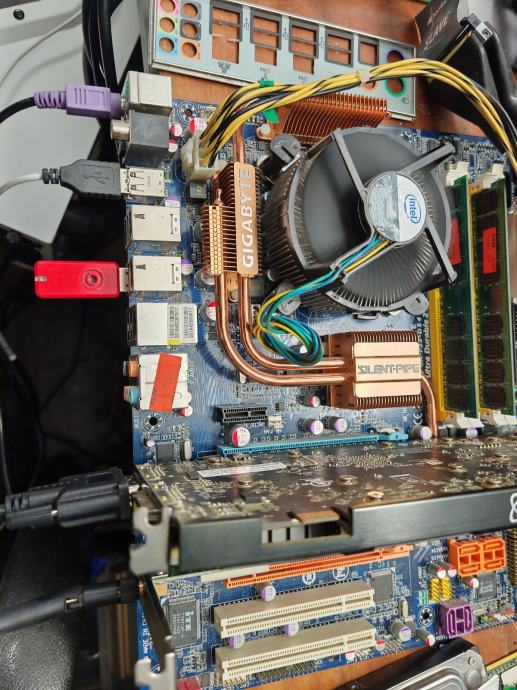 Prodajem Gigabyte GA-P35-DS4 matičnu ploču s Intel Q6600 procesorom i 4GB DDR2 memorije. Matična ploča ima LGA775 utor za procesor i četiri PCI Express utora. Intel Q6600 je quad-core procesor koji radi na 2.40GHz. Memorija je organizirana u dva modula po 2GB DDR2 RAM-a.