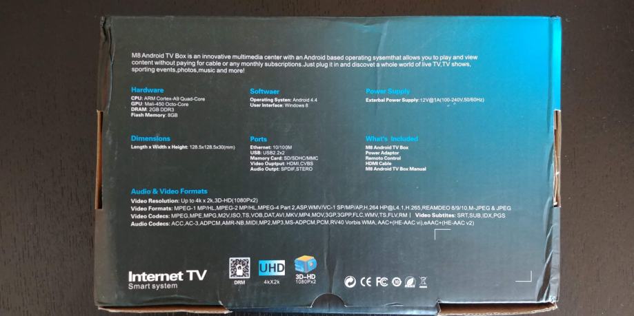 Model: M8, CPU: Amlogic S802, Core: Quad Core, GPU: Mali-450, RAM: 2G, ROM: 8G.