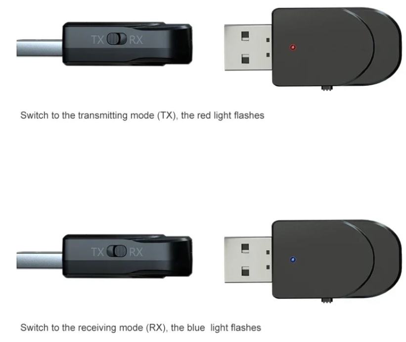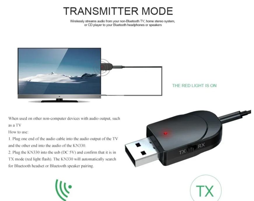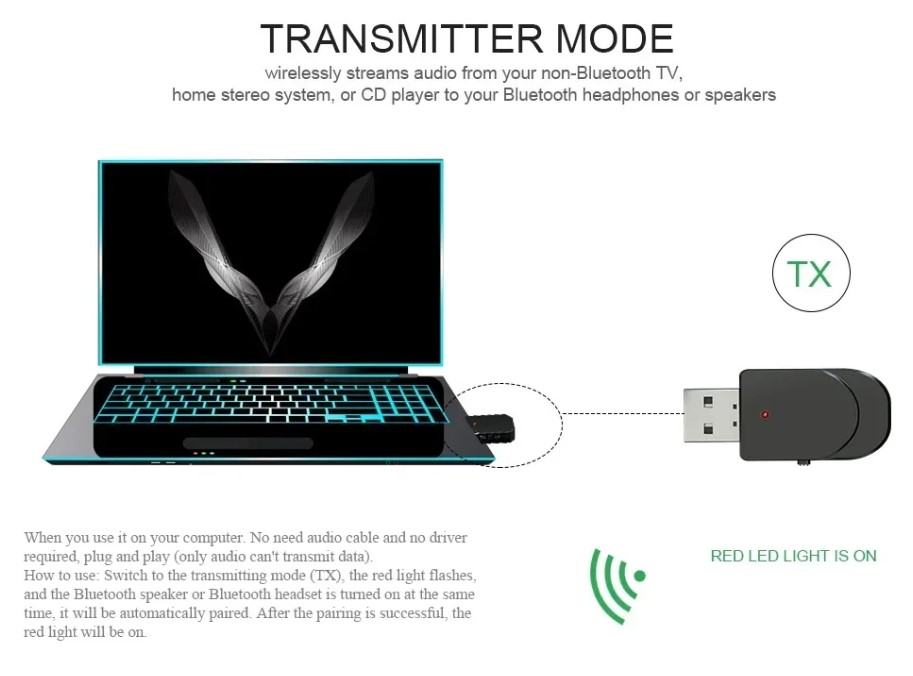 Koristite TX način rada na računalu i TV-u: Priključite USB u USB priključak računala i automatski potražite druge Bluetooth uređaje za primanje (kao što su Bluetooth slušalice, Bluetooth zvučnik, Bluetooth prijemnik itd.). Prilikom uparivanja crveno svjetlo treperi i crveno svjetlo prestaje treptati.