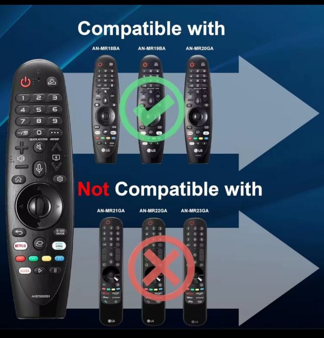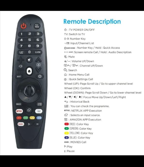 OVAJ DALJINSKI NIJE PO TIPU "MAGIC REMOTE LGTV, ALI IZVANREDNO FUNKCIONIRA PRAKTIČNO NA SVIM LG TV MODELIMA I IMA PRAKTIČNO SVE FUNKCIJE KAO I BILO KOJI LG TV DALJINSKI, VRLO FULIDAN, BRZ,PREGLEDAN I POUZDAN I ČAK PO MNOGIM FUNKCIJAMA PUNO BOLJI NEGO LI I POSLJEDNJI MODELI MAGIC LGTV DALJINSKIH UPRAVLJAČA MR24GA I SLIČNO !