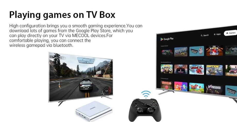 Putem Google Play trgovine dostupne su brojne aplikacije i igre koje možete koristiti direktno na TV-u. Moguće je povezati bežični gamepad putem Bluetootha.