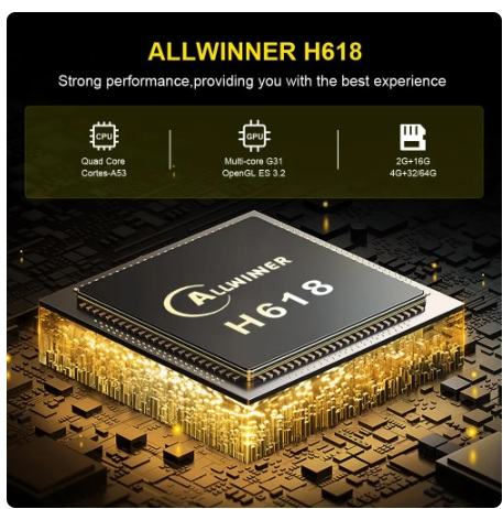 - CPU: Allwinner H618 četverojezgreni 64-bitni Cortex-A53;