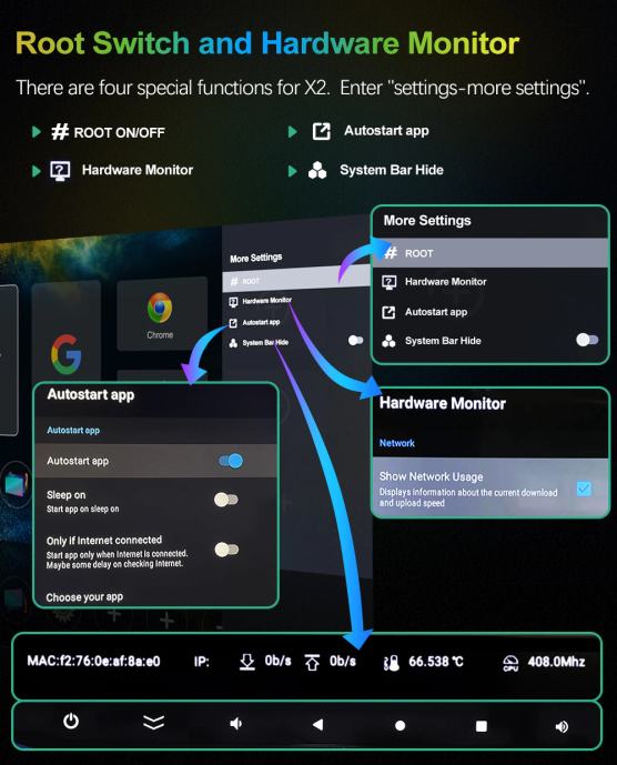 Prilagodba korisničkog sučelja, Root On/Off, Autostart App; promjenjiva pozadina, Google glasovni unos; bežična nadogradnja (OTA).