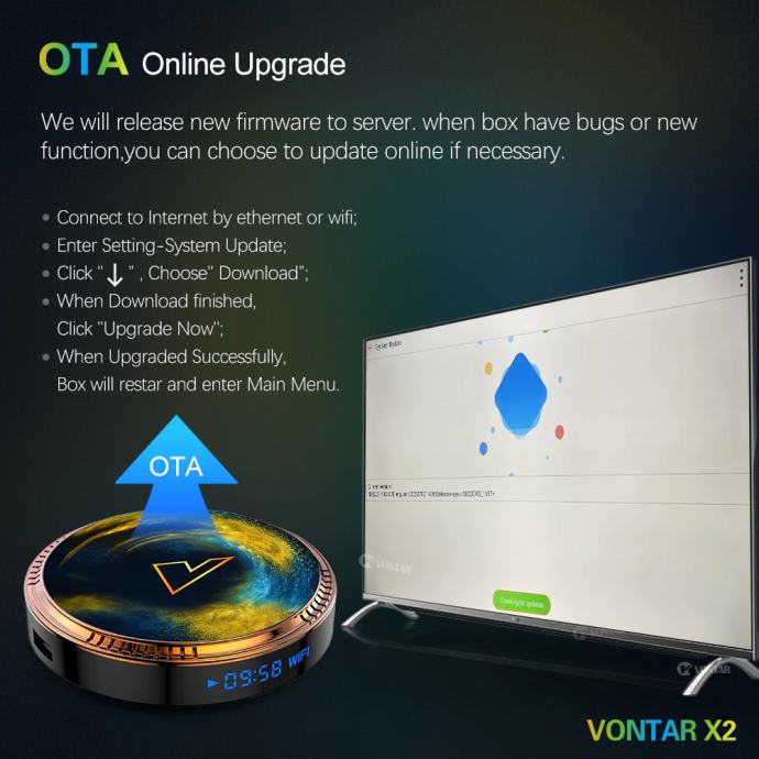 Paket uključuje;1 x VONTAR X2 TV Box (original pakiranje), 1 x 2.4G glasovni daljinski upravljač, 1 x napajanje, 1 x HD kabel, 1 x korisnički priručnik.