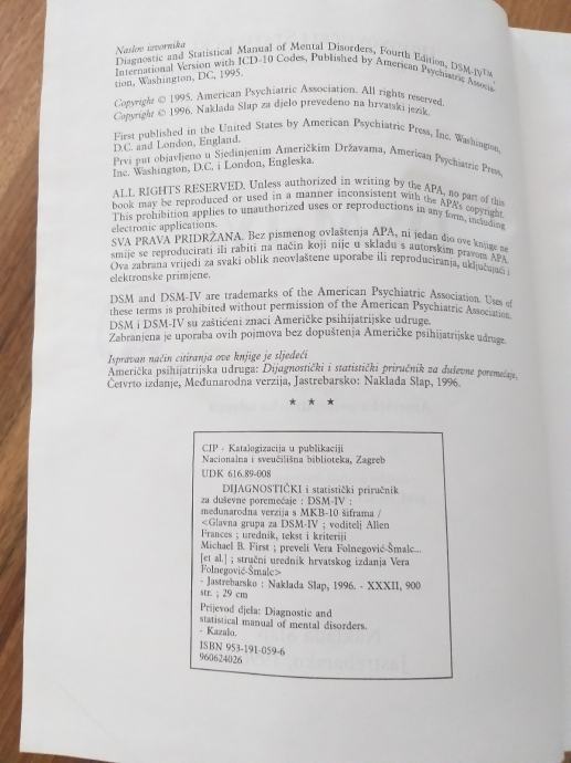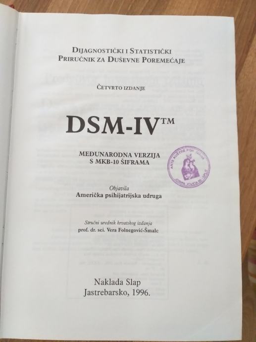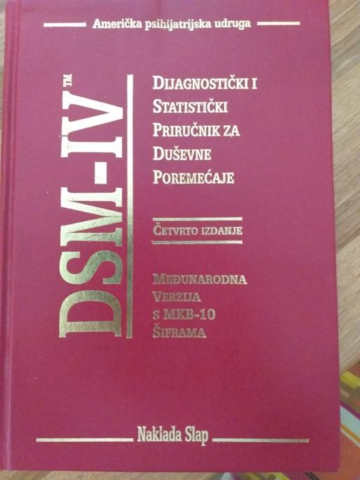 Prodajem 4. izdanje Dijagnostičkog i statističkog priručnika za duševne poremećaje iz 1996. godine. Izdavač je Naklada Slap. Broj stranica: 900.