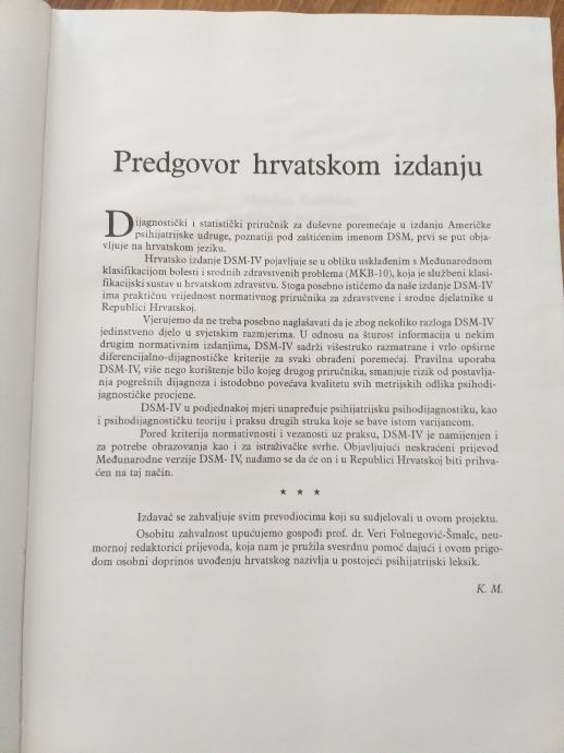 Dijagnostički i statistički priručnik za duševne poremećaje u izdanju Američke psihijatrijske udruge, poznatiji pod zaštićenim imenom DSM, prvi se put objavljuje na hrvatskom jeziku. Hrvatsko izdanje DSM-IV pojavljuje se u obliku usklađenim s Međunarodnom klasifikacijom bolesti i srodnih zdravstvenih problema (MKB-10), koja je službeni klasifikacijski sustav u hrvatskom zdravstvu. Stoga posebno ističemo da naše izdanje DSM-IV ima praktičnu vrijednost normativnog priručnika zdravstvene i srodne djelatnike u republici Hrvatskoj. Vjerujemo da ne treba posebno naglašavati da je zbog nekoliko razloga DSM-IV jedinstveno djelo u svjetskim razmjerima. U odnosu na šturost informacija u nekim drugim normativnim izdanjima, DSM-IV sadrži višestruko razmatrane i vrlo opširne diferencijalno-dijagnostičke kriterije za svaki obrađeni poremećaj. Pravilna uporaba DSM-IV, više nego korištenje bilo kojeg drugog priručnika, smanjuje rizik od postavljanja pogrešnih dijagnoza i istodobno povećava kvalitetu svih metrijskih odlika psihodijagnostičke procjene. DSM-IV u podjednakoj mjeri unapređuje psihijatrijsku psihodijagnostiku, kao i psihodijagnostičku teoriju i praksu drugih struka koje se bave istom varijancom. Pored kriterija normativnosti i vezanosti uz praksu, DSM-IV je namijenjen i za potrebe obrazovanja kao i za istraživačke svrhe. Objavljujući neskraćeni prijevod Međunarodne verzije DSM-IV, nadamo se da će on i u Republici Hrvatskoj biti prihvaćen na taj način.