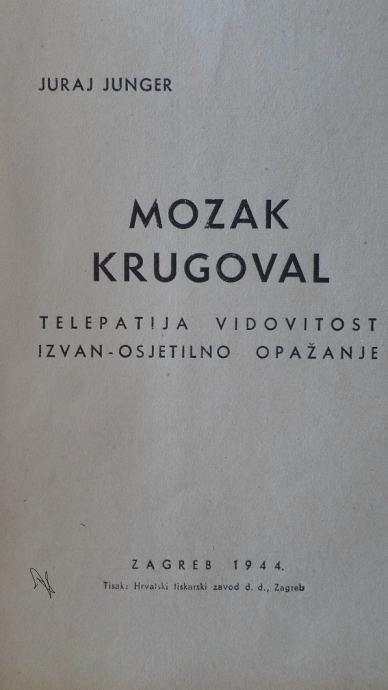 Prodajem knjigu MOZAK KRUGOVAL(telepatija,vidovitost,izvan-osjetilno opažanje Juraja Jungera, iz 1944.god.na 90 stranica,u izvrsnom stanju.