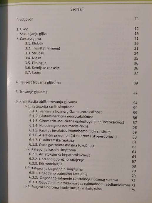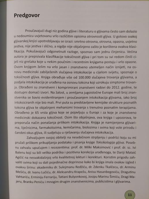 Proučavajući dugi niz godina gljive i literaturu o gljivama vrlo često sam dolazio u nedoumicu uvjetovanu vrlo različitim opisima otrovnosti gljiva. U gotovo svakoj gljivarskoj knjizi upotrebljavaju se izrazi: smrtno otrovna, otrovna, opasna, uvjetno jestiva, nije jestiva i slično, a nigdje nije objašnjeno zašto je korištena ovakva klasifikacija. Pokušavajući odgonetnuti razloge spoznao sam jednu činjenicu. Većina autora je prepisivala klasifikacije toksičnosti gljiva i pri tom su svi redom činili cijeli niz pogrešaka koje u nekim poučnim i recentnim knjigama postaju i vrlo opasne. Ovom knjigom želim na vrlo jasan i znanstveno utemeljen način iznijeti na temelju medicinski zabilježenih slučajeva intoksikacije u cijelom svijetu spoznaje o toksičnosti gljiva. Knjiga obrađuje više od 100.000 slučajeva trovanja gljivama, a podjela intoksikacija je urađena na osnovu toksina koji uzrokuju simptome trovanja. Obrađeni su znanstveni i komprimirani znanstveni radovi do 2012. godine, te dostupni domaći izvori. Na žalost u zemljama jugoistočne Europe mali broj znanstvenika se bavio evidentiranjem i proučavanjem intoksikacija gljivama, iako broj intoksiciranih nije bio mali. Prvi puta su predstavljene kemijske strukture poznatih toksina gljiva, te objašnjeni mehanizmi trovanja s trenutno poznatim terapijama. Obrađeno je 65 vrsta gljiva koje se pojavljuju u Europi i za koje je znanstveno medicinski dokazana toksičnost. Osim što objašnjava, ova knjiga i upozorava, te preporuča način ponašanja prilikom intoksikacija. Knjiga je namijenjena gljivarima, liječnicima, farmakolozima, kemičarima, biolozima i svima koji vole prirodu i čarobni okus gljiva, ali i sudjeluju u rješavanju slučajeva intoksikacija.