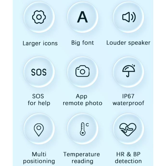Ali najvažnije od svega, naš sat nije samo alat za praćenje lokacije i detekciju pada. On je vaša osobna asistencija za zdravlje i sigurnost. S većim i glasnijim zvučnikom, automatskim preuzimanjem poziva, funkcijom praćenja zdravlja, provjerom tjelesne temperature u stvarnom vremenu, podsjetnicima za lijekove i sjedenje, brojačem koraka te mnogim drugim značajkama, naš sat brine o vašim najmilijima u svakom trenutku.