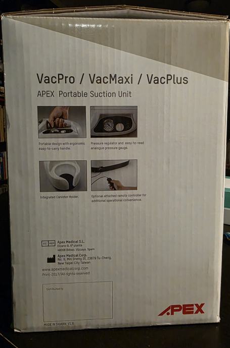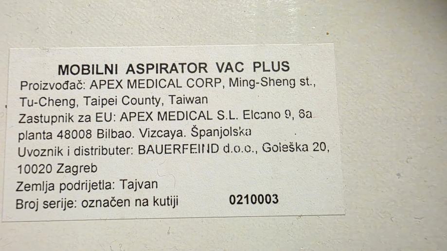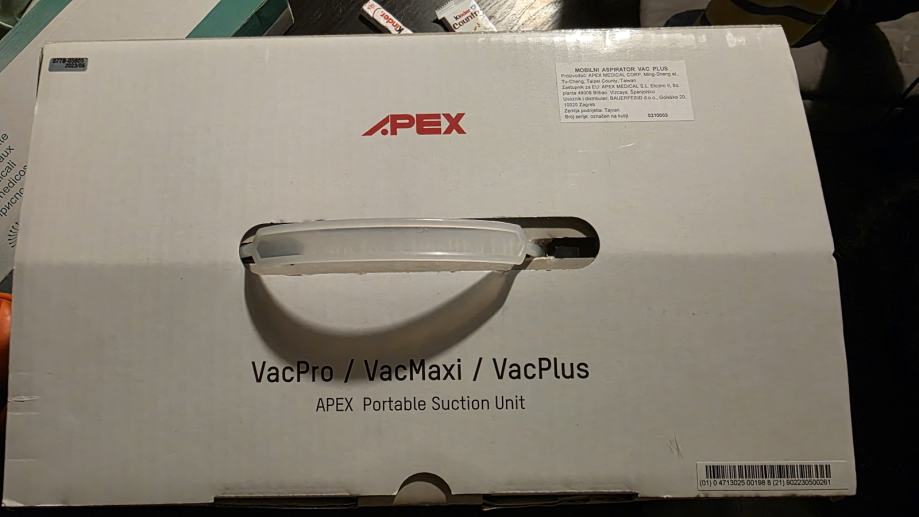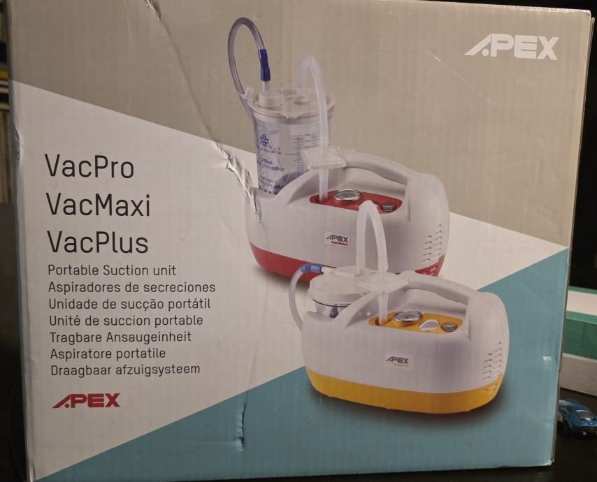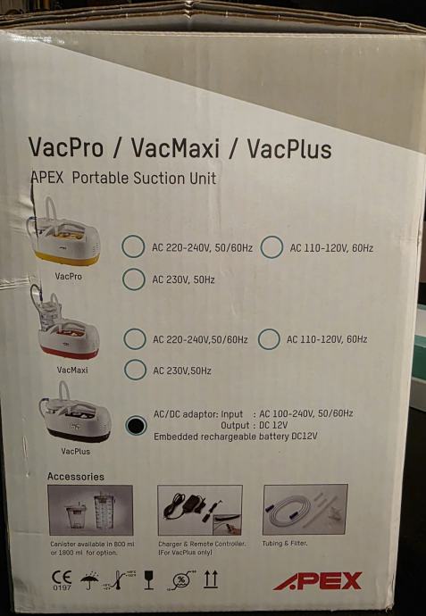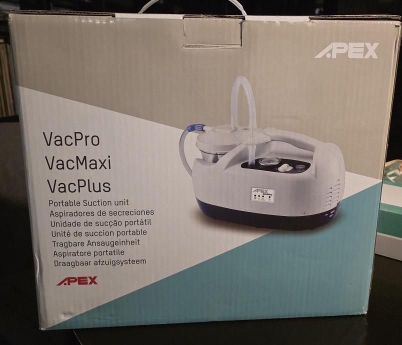 • Aspirator za kućnu upotrebu Apex VacPlus služi za održavanje higijene bronhija i usne šupljine s područjem primjene bronhijalna higijena, oralna higijena, te za učinkovito oslobađanje dišnih puteva s izvanrednim mogućnostima sprečavanja infekcija.