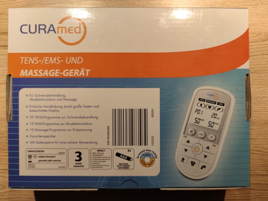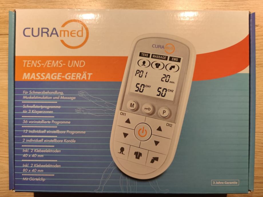Digitalni uređaj za TENS/EMS CURAMED . Višefunkcijski uređaj (3 u 1) koji vrši terapiju protiv bolova (TENS) pri upali i uklještenju živaca, stimulira rad mišića (EMS) i služi za opuštanje i masažu mišića. Dva odvojena, zasebno podesiva kanala s četiri elektrode (2kom 40x40mm + 2kom 80x40mm). Izuzetno ugodna elektroterapija s 56 predefiniranih programa terapije i 12 slobodno podesivih programa.