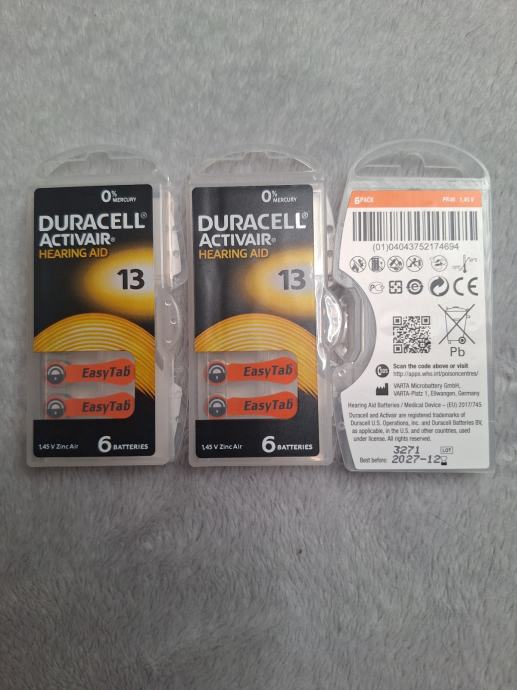 Pakiranje od 6 baterija za slušni aparat, Duracell Activair tip 13. Cijena 5 EUR. Imam 10 kutijica.