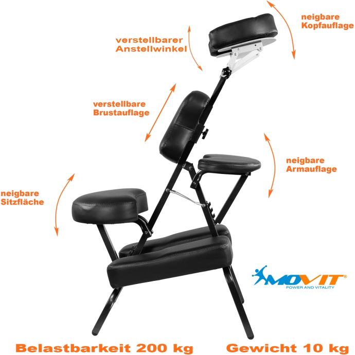Čisto opuštanje i wellness! Masažne fotelje MOVIT omogućuju tretmane koji su nezamislivi na stolu za masažu, kao što su kiropraktičke i osteopatske primjene. Visokokvalitetna masažna fotelja MOVIT može se koristiti na različite načine, od mobilne masaže, korištenja u fizikalnoj i radnoj terapiji, rehabilitaciji, akupunkturi do tetoviranja. Sjedalo i naslon za ruke su podesivi, a visina i kut naslona za glavu također se mogu podesiti. Profesionalna masažna fotelja može se sklopiti radi uštede prostora. Zahvaljujući maloj težini i torbi za nošenje uključenoj u isporuku, može se lako transportirati.
