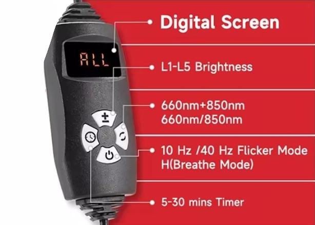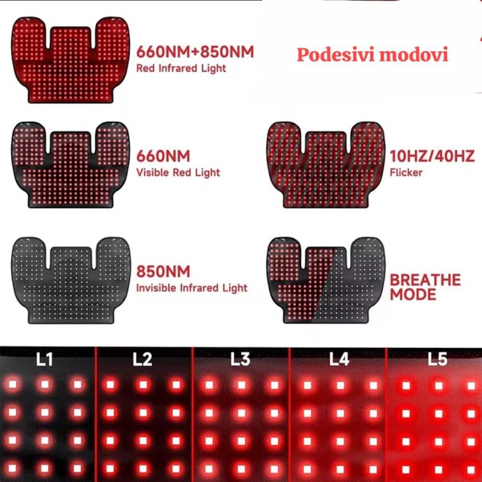 Moguće odabrati između četiri načina rada: crveno svjetlo od 660 nm, svjetlo bliskog infracrvenog zračenja od 850 nm, način rada od 660 nm + 850 nm. Svaki način rada nudi 5 podesivih razina svjetline za optimalnu učinkovitost. Pogodno za sportske ozljede, ukočeni vrat i ramena, bolove u leđima, bol u mišićima i popravak tkiva.