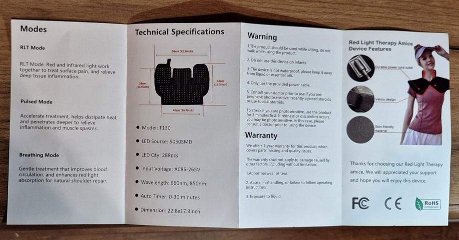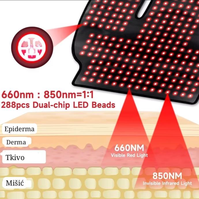 Nova navlaka za vrat s crvenom svjetlosnom terapijom ima 288 ugrađenih LED kuglica s dva čipa. Crveno svjetlo od 660 nm poboljšava izgled kože i ubrzava zacjeljivanje sportskih ozljeda, dok svjetlo bliskog infracrvenog zračenja od 850 nm (nevidljivo) prodire duboko u tkiva kako bi ublažilo bol i poboljšalo cirkulaciju krvi.