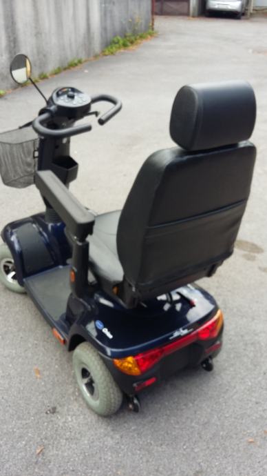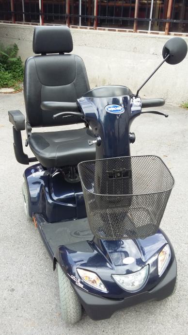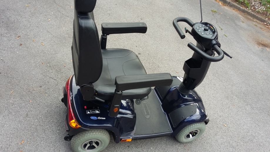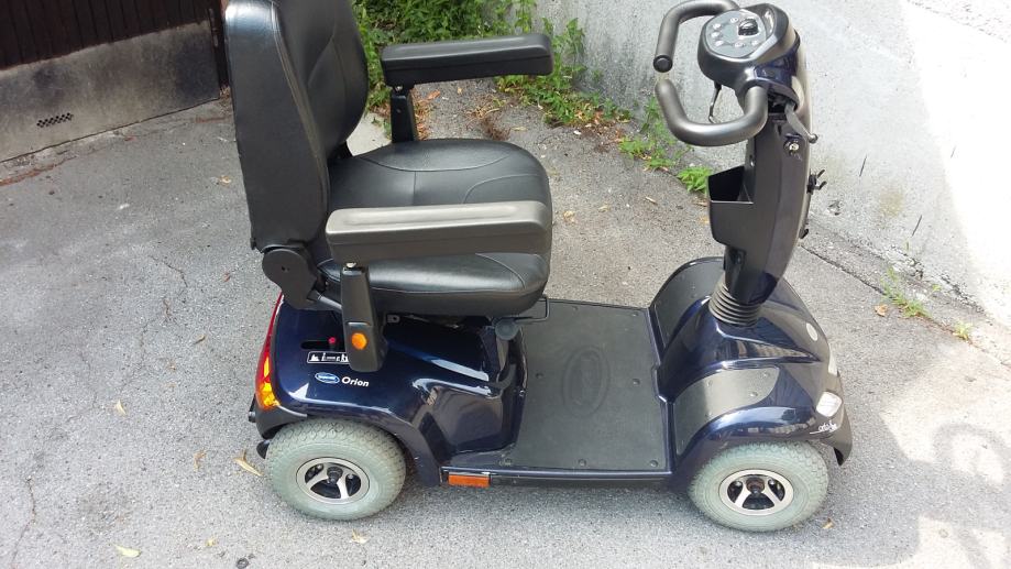 Invalidska kolica- skuter ORION Njemački,pogodan za starije islabo pokretne osobe.Elektronsko upravljanje ,maksimalna brzina je 10km/h,a vožnja je vrlo udobna jer ima amortizere i veoma udobno sjedište kao kod avtomobila-podesivo napred-nazad,naslon isto i okreče se za 360° Nosivost je 150 kg.Skuterom se može upravljati jednom rukom,bez upotrebe noga jer sam koči-smanjuje brzinu nizbrdo ili kod skretanja,pa je tako i zaštićen od prevrtanja. Uz skuter je i avtomatski punilac koji sam izračuna vreme punjenja a troškovi su zanemarljivi.Skuter ima ugradjene GEL akumulatore 2x 50Ah nove generacije bez održavanja, pa ga možete puniti u dnevnoj sobi jer nema nikakvog mirisa kiseline. Kormilo je podesivo, podesivi su i nasloni za ruke. Može se voziti u prtljažniku većine karavan automobila. Skuter nije potrebno registrovati,ne treba vam ni vozačka dozvola,u saobračaju se tretira kao bicikl.Zaštiten je od vlage i vode,kiša mu ne može štetiti jer su svi elektronski djelovi i akumulatori ispod pokrova sjedišta