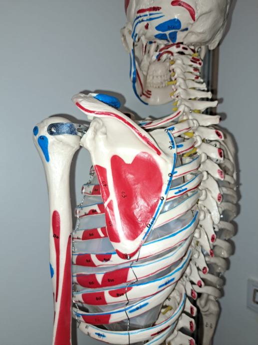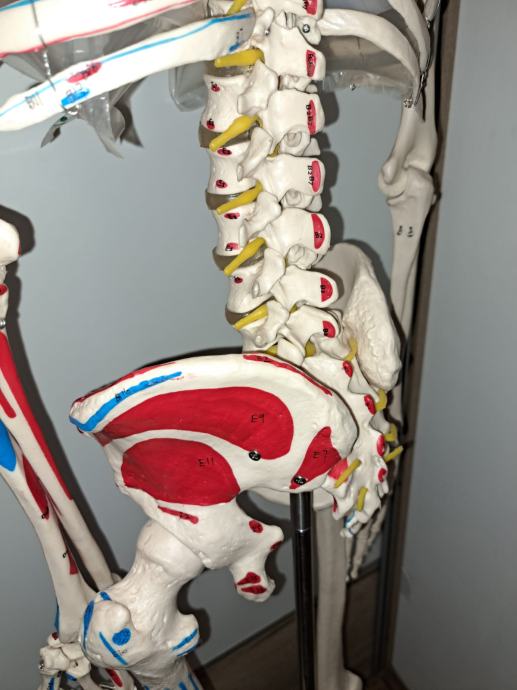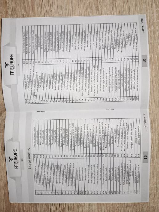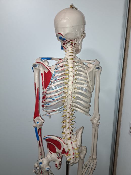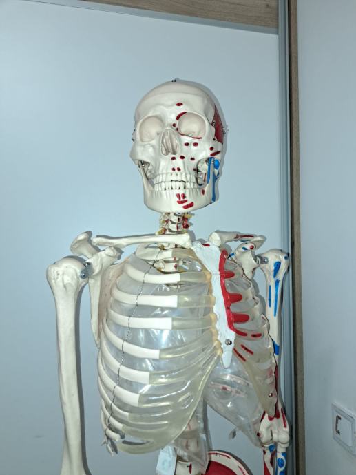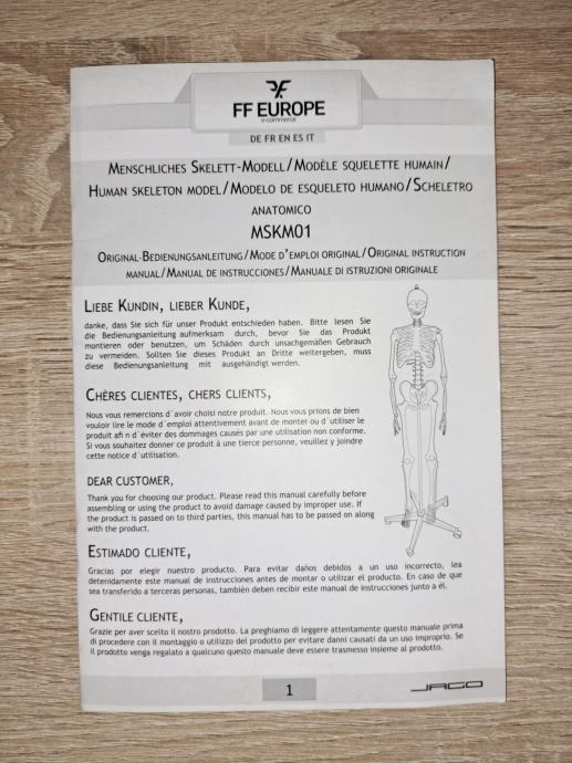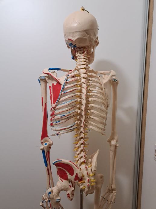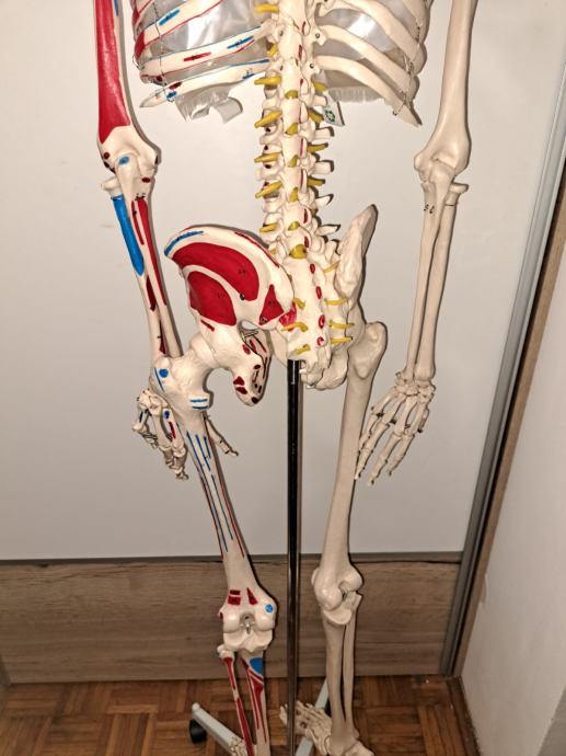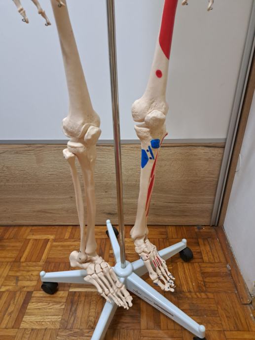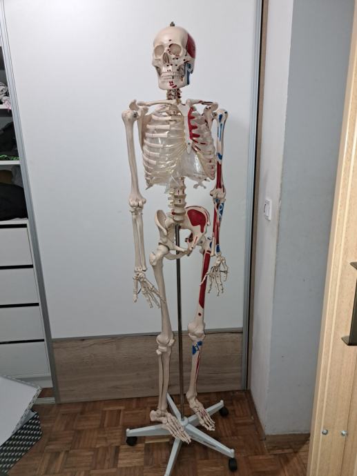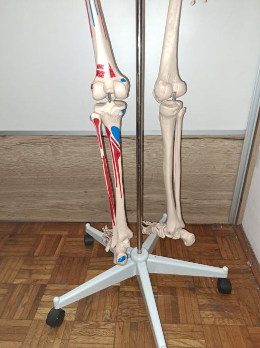 Model je na kotačima, kosti imaju sve strukture, također su označeni mišići koji su imenovani u knjižici na engleskom, francuskom, španjolskom, njemačkom i talijanskom jeziku.
