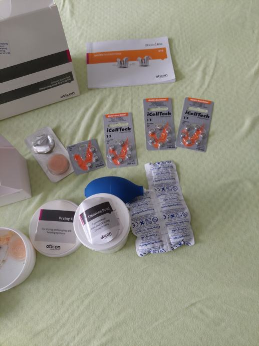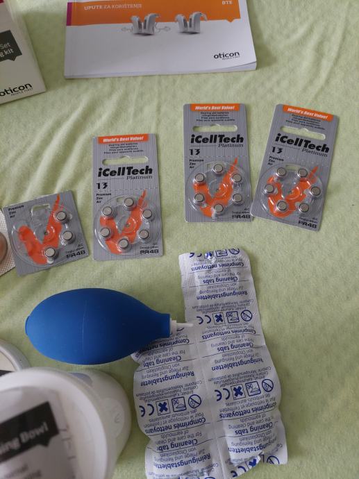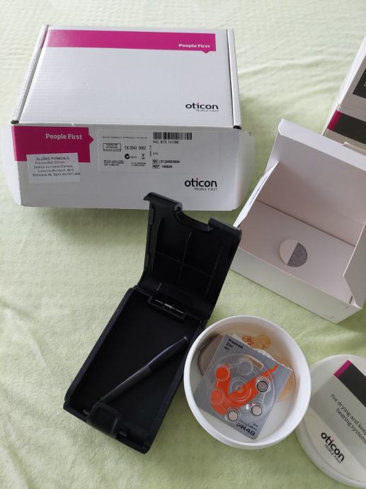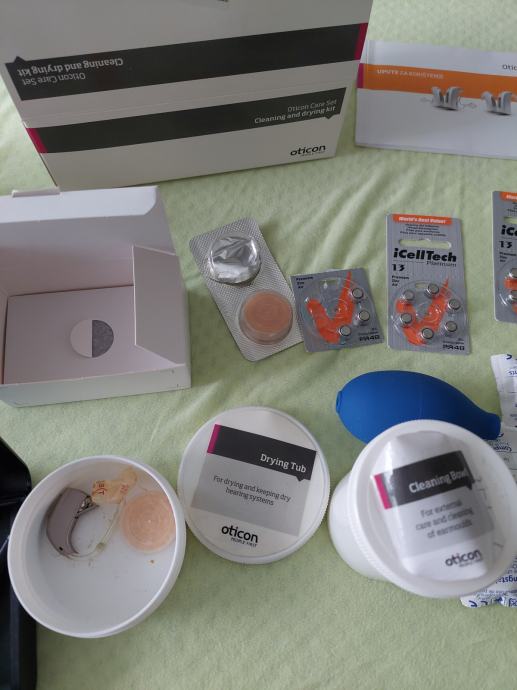 DANSKI OTICON INO, BTE 13; dodatna oprema; baterije; tablete, posuda i pumpica za čišćenje; sve po slikama
