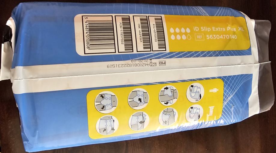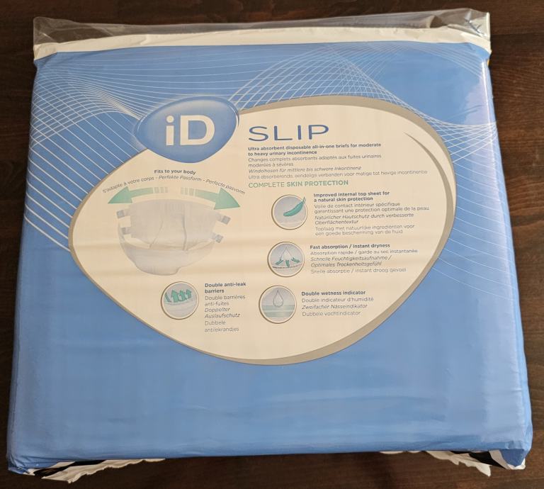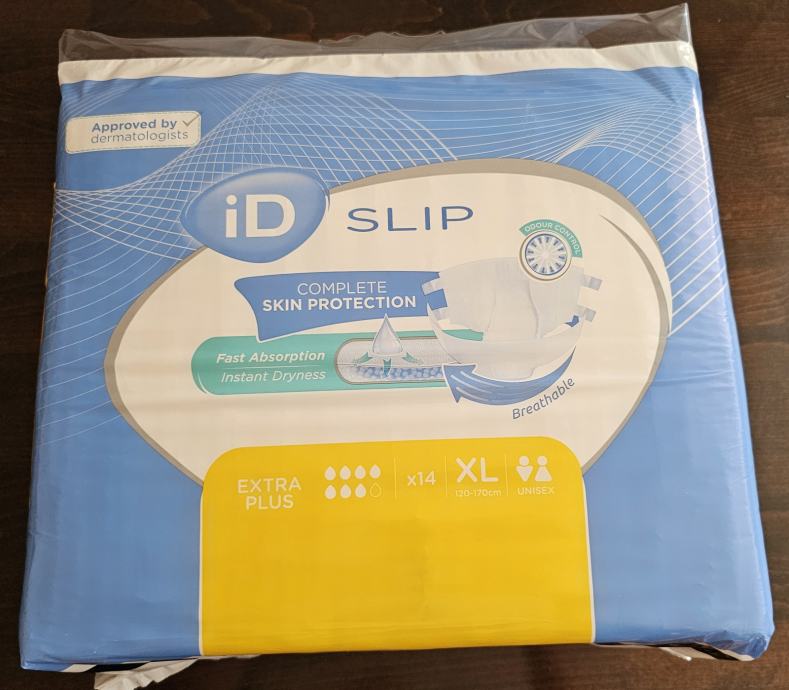 Pelene za odrasle ID SLIP, complete skin protection, brzo upijajuće, visoke moći upijanja, sa 4 trake za lijepljenje, XL, unisex, dermatološki odobrene prodajem. Posjedujem 16 pakiranja, a u pakiranju je 14 pelena. Može se kupiti i pojedinačno pakiranje. Cijena po pakiranju je 4 EUR-a.