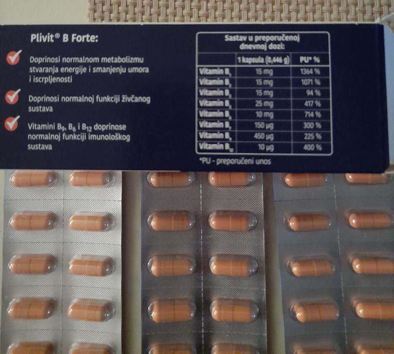 Prodajem plivit B Forte kapsule za smanjenje umora i iscrpljenosti, vitamine na preporuku lijecnika kupila ali zbog alergije ne mogu koristiti. Nedostaju 3 kapsule. Placene su 49.95 kn a prodajem za 35 kn. Informacije na tel 035 260 202