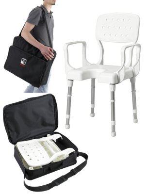 Tuš stolica za putovanje. S naslonima za ruke od plastike i aluminija. Otporan na prljavštinu. Jednostavno čišćenje s komercijalnim deterdžentima. Koža-friendly. 7 položaja visine. S praktičnom torbom