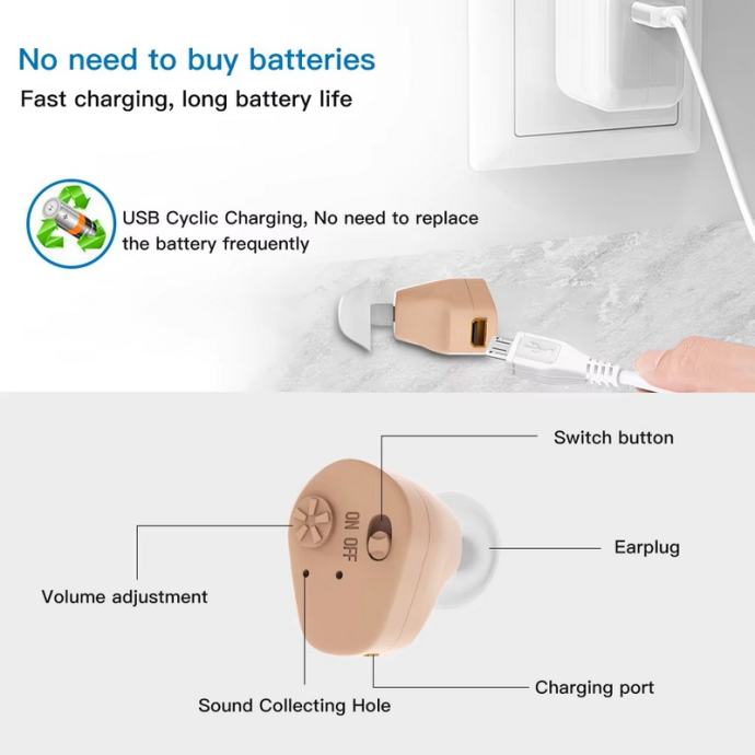 Slušni aparat (Punjivi slušni uređaj 5V ) ima svoju bateriju, puni se sa adapterom 5V za mobitel