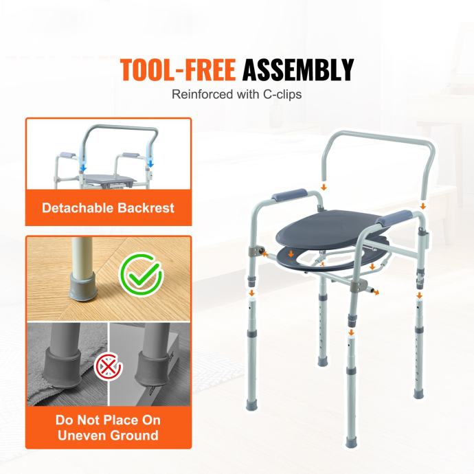 Neklizajući nasloni za ruke i jastučići za noge: Opremljena neklizajućim gumenim jastučićima za noge za vrhunsku stabilnost i dodatnim zamjenjivim jastučićima, ovaj toaletni okvir održava sigurno prianjanje na kupaonske pločice i podove spavaće sobe, smanjujući rizik od klizanja.