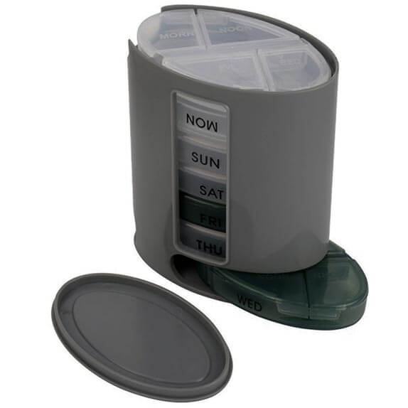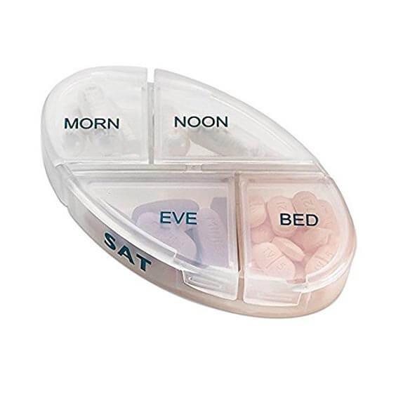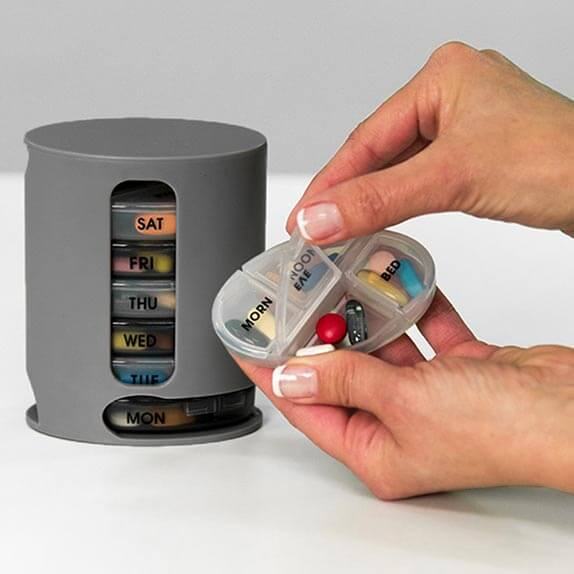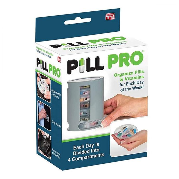 Pill Pro dozator nudi 7 uklonjivih kutija za svaki dan u tjednu, s jasno označenim danima. Svaka kutija ima četiri odvojena odjeljka – za jutarnju, poslijepodnevnu, večernju i noćnu dozu. Ovaj sustav omogućuje preciznu organizaciju lijekova i vitamina, a puni se lako i brzo.