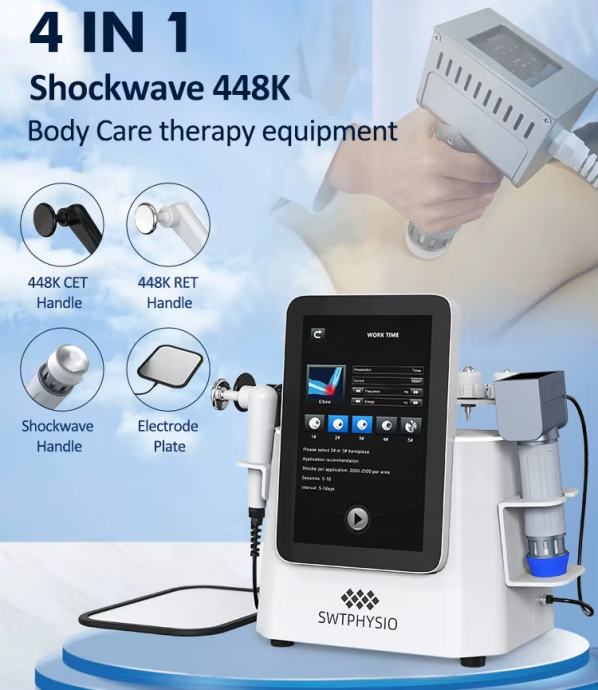 Profesionalni 4-u-1 terapijski uređaj koji kombinira udarni val (Shockwave 448K) i radiofrekvencijsku (RF) tehnologiju – CET i RET, namijenjen za fizikalnu terapiju, rehabilitaciju, masažu i estetske tretmane