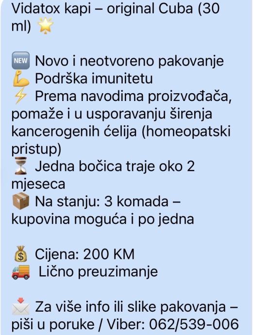Novo neotvoreni pakovanju vidatox kapi, sve piše u opisu slike molim zvati na 062/539006