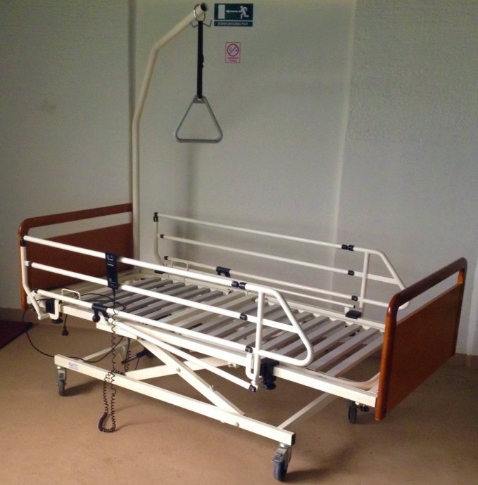 Kreveti s električnim motorom imaju funkciju podizanja uzglavlja i podnožja i cijelog kreveta po visini. Krevet ima rukohvat (trapez) i ograde. Ima kotače koji imaju kočnice.