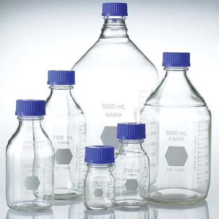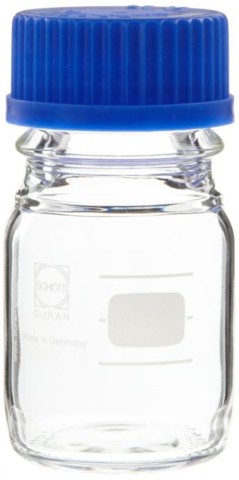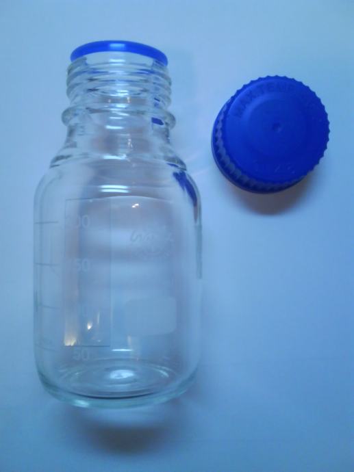 Laboratorijska staklena boca sa plavim čepom na navoj.