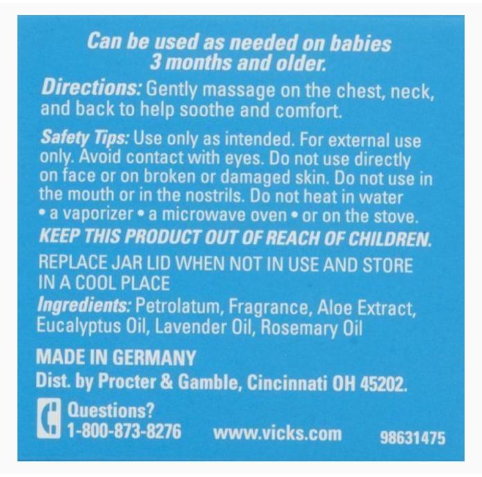 Također, dostupna je i bočica Vicks Baby Rub prikladna za bebe starosti od 3 mjeseca nadalje.