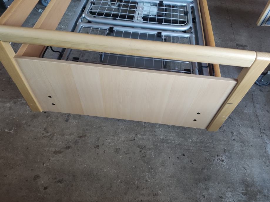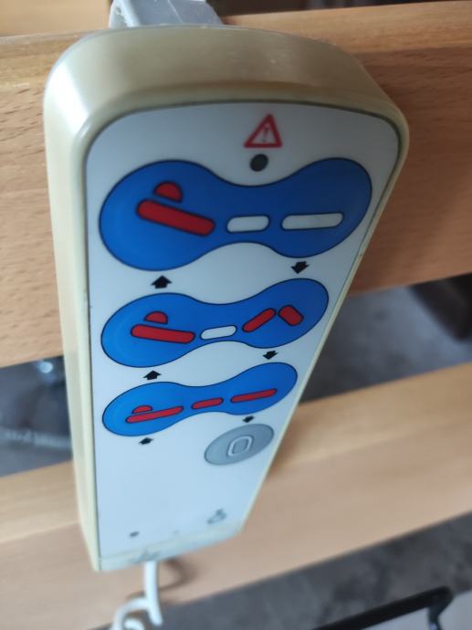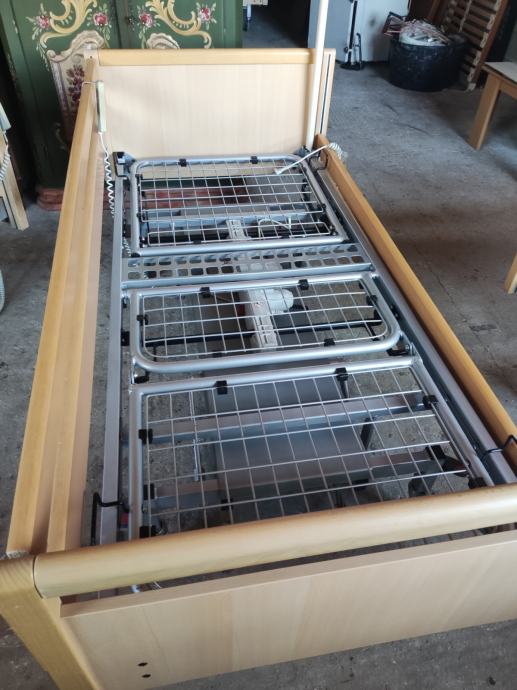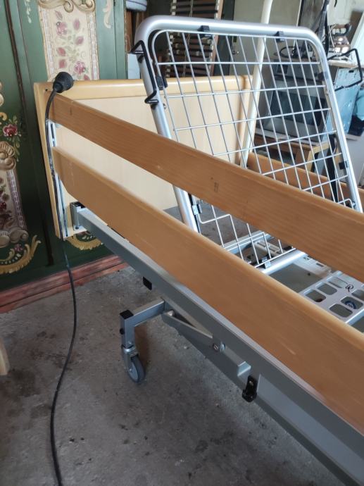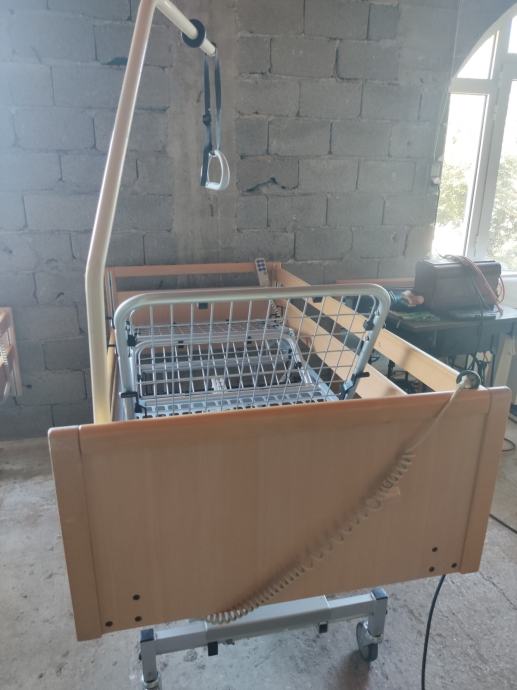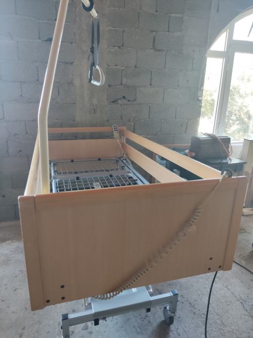 Opremljen svim funkcijama...podizanje uzglavlja,uznožja,cijeli krevet se podiže dosta visoko i spušta dosta nisko,bočne strane se spuštaju,kotačići sa kočnicama,šipka sa trokutom za samopodizanje