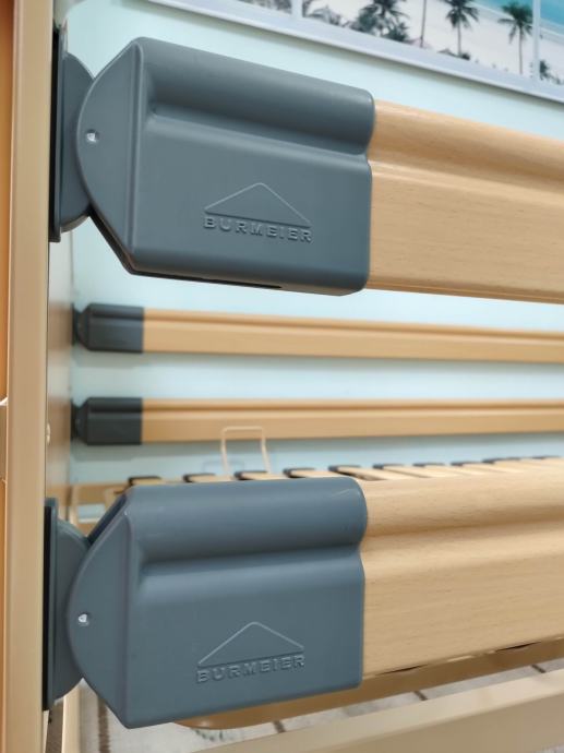 Krevet renomiranog njemačkog proizvođača Burmeier, model "Dali ᛒt" u dekoru bukve. Standardnih dimenzija 200x90 cm, s četverodijelnom podnicom izrađenom od latofleks letvica.