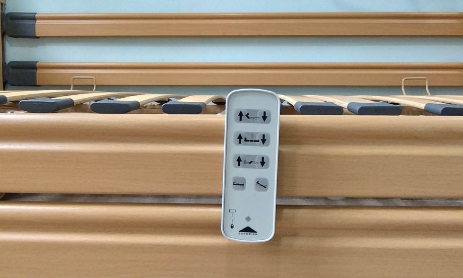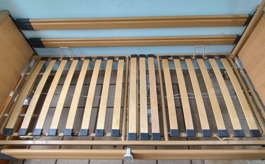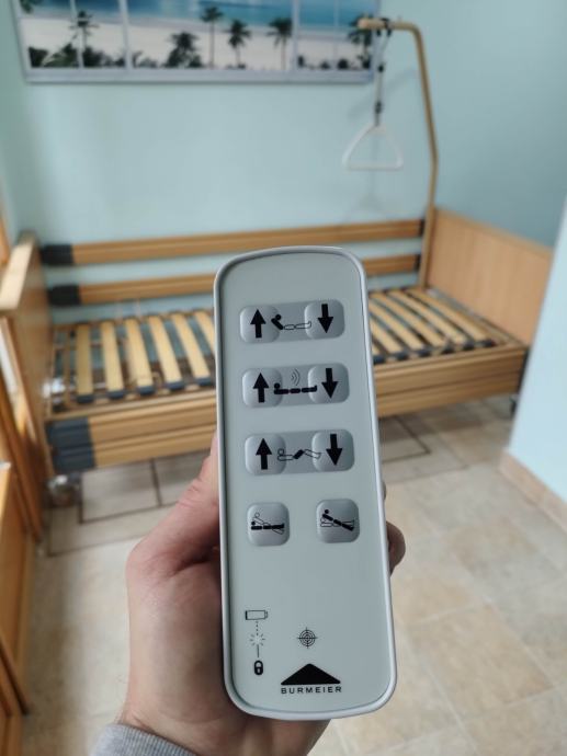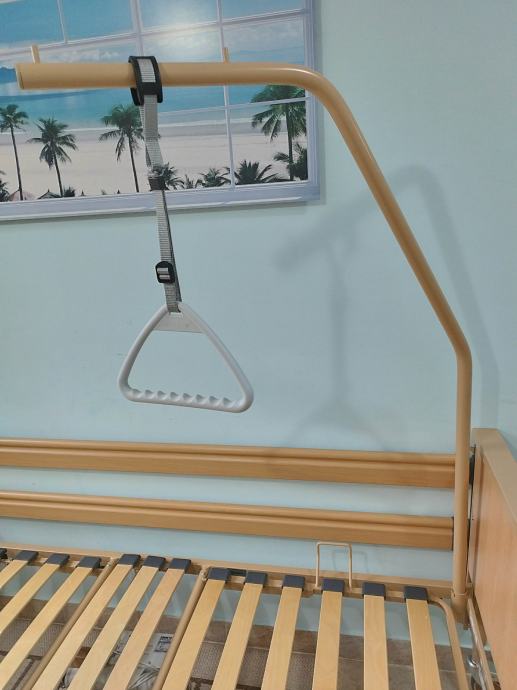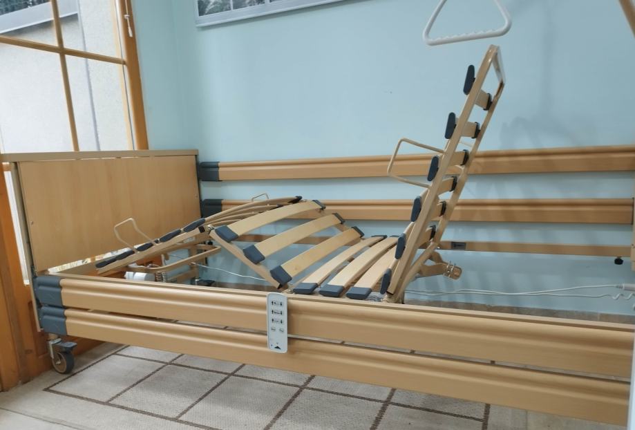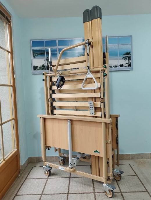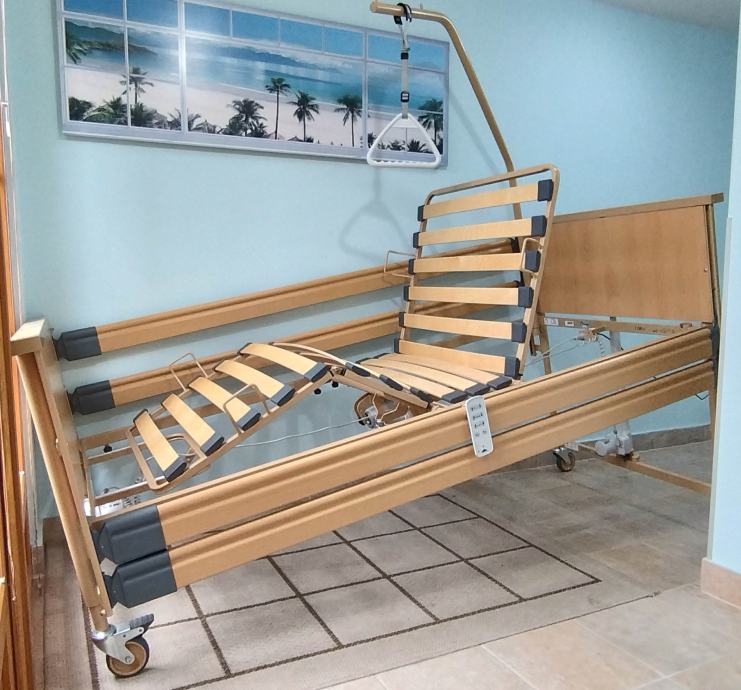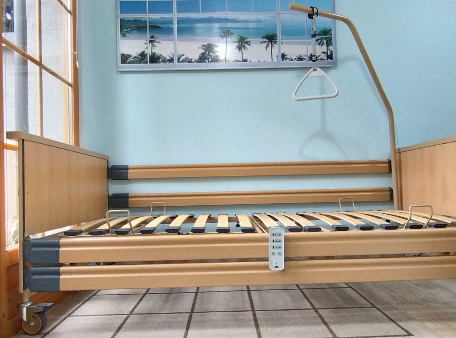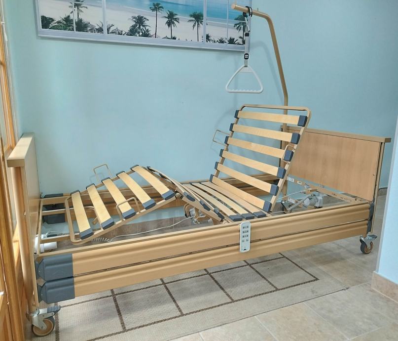 Odlično očuvan električni bolnički krevet s trapezom i trokutom za podizanje. S bežičnim ručnim upravljačem (pilot).